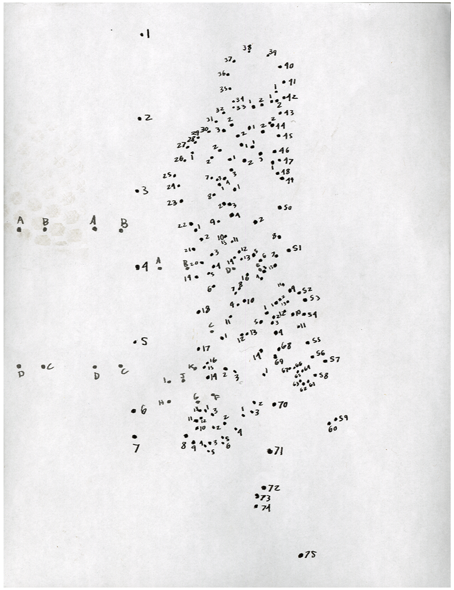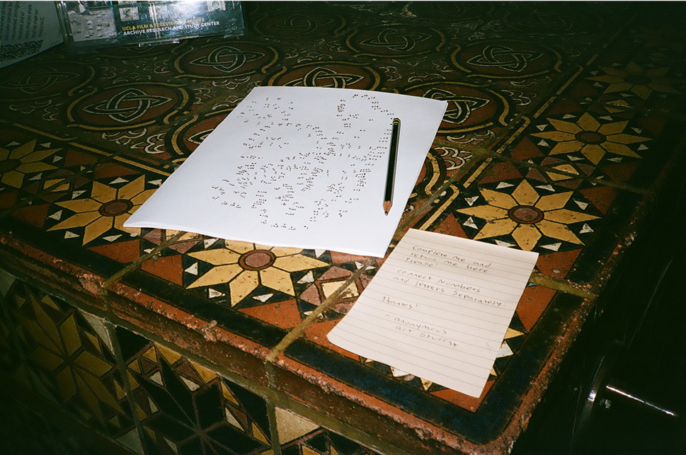 In this piece, I interact with the public through a series of copies from four blank connect the dots sheets. Each ghost image reveals both a figure, as well as text that overlaps between the pieces. Over the course of a day, I set up series of piles of these blank worksheets, each with a writing implement, as seen in the photos attached. None were returned filled, and the only proof I received of human interaction with the piece was the scuffed imprint of a patron’s boot upon series image 2 (last slide). Untitled (11/18/25) is about my reality of safety as a queer man- that even in an American city that promotes itself as a “safe space” for LGBTQ+ people, my identity is something I rarely share about. To most people I interact with, it comes more as a series of “connect-the-dots” that may build a map of who I am or am not. Like Untitled (11/18/25), this map is incredibly intricate. On the occasion a patron may connect it, it’s most likely that the image built will be constructed "incorrectly" and in the image of themself, not of me. Untitled (11/18/25) suggests that you pick up a pencil, and consider what information those around you share willingly about themselves.